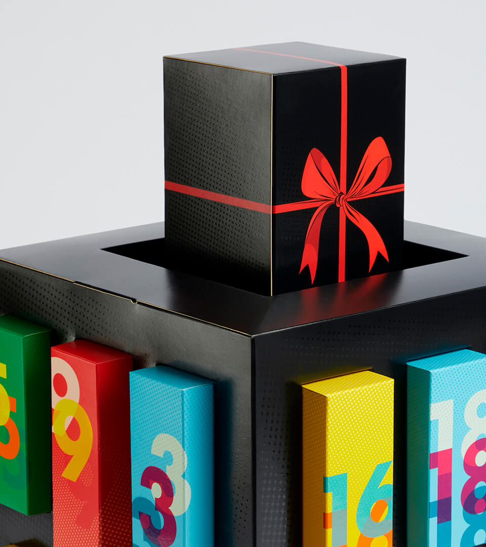 Das Ergebnis ist ein auffälliger, würfelförmiger Kalender, der mit kräftigen Farben und hochwertigen Lackveredelungen sofort ins Auge fällt. Anstelle traditioneller Türchen verfügt er über herausnehmbare Schachteln, die auf allen vier Seiten des Würfels verteilt sind und so das tägliche Entdecken zu einem rundum erlebbaren Highlight machen.