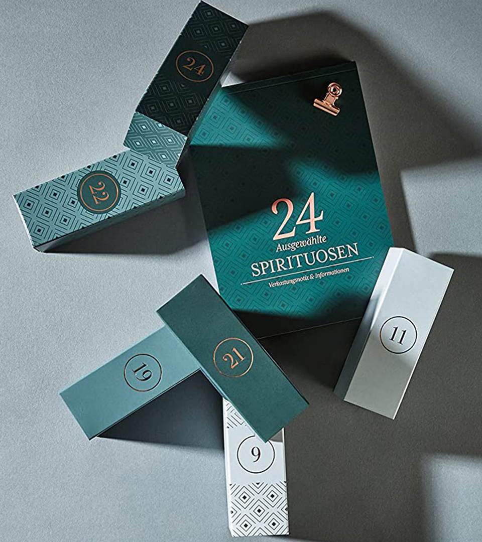 Für echte Genießer: Der Spirituosen-Adventskalender vereint traditionelles Türchenöffnen mit innovativem Design. Die Seiten verbergen nicht nur hochwertige Spirituosen, sondern auch ein edles, verstecktes Booklet mit spannenden Infos zu den Must-haves für die Hausbar, ausführliche Beschreibungen zu den verschiedenen Alkoholsorten und den exklusiven Produkten hinter jedem Türchen. Das edle dunkelgrüne Design mit Goldprägung verleiht dem Kalender eine luxuriöse Note – eine einzigartige Kombination aus klassischem Aufreißen und einem Schachtelkalender zum Herausziehen.