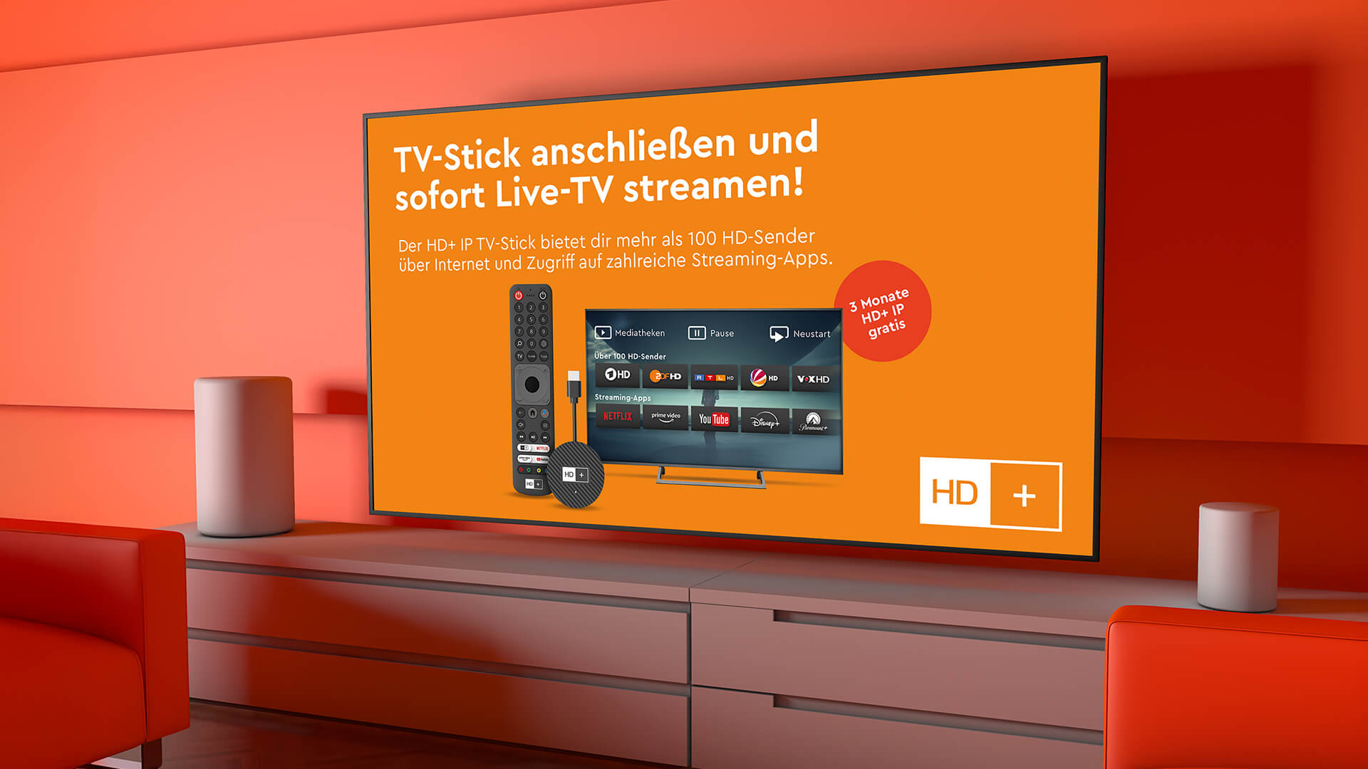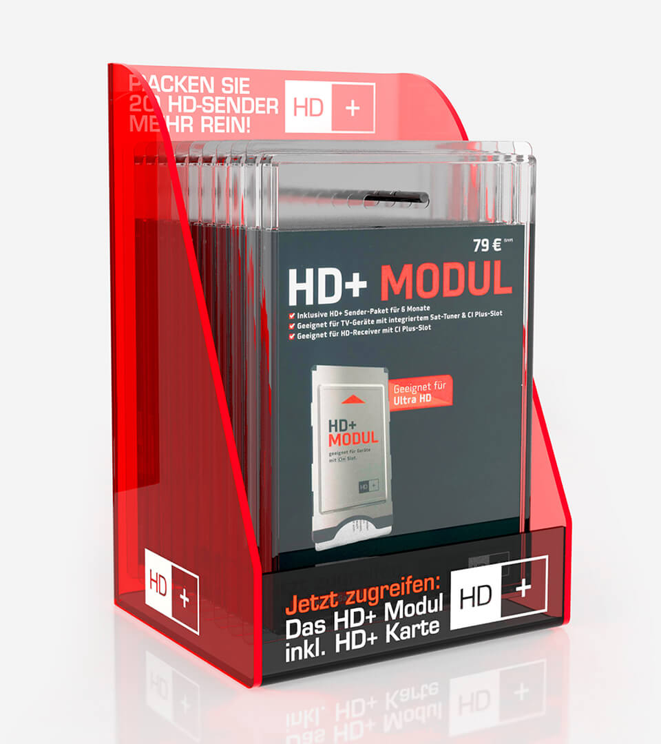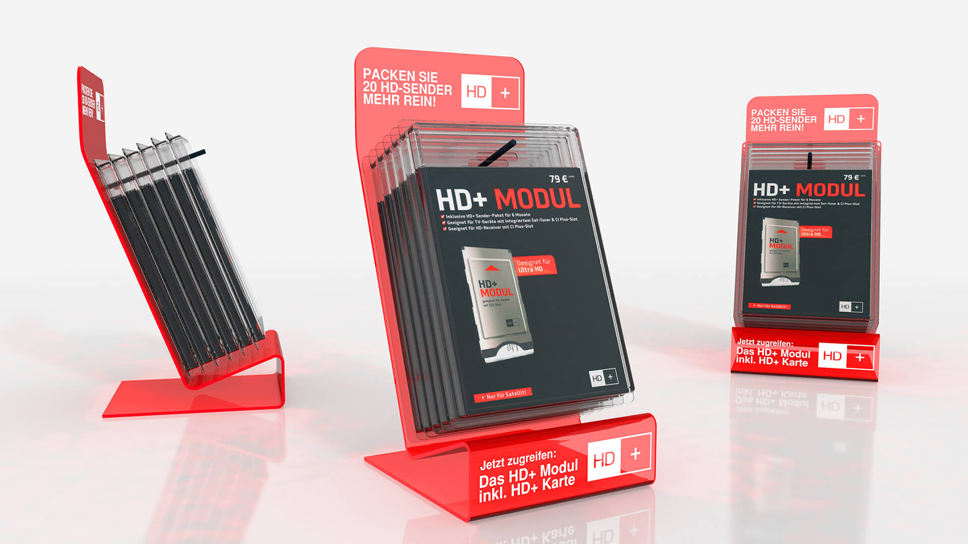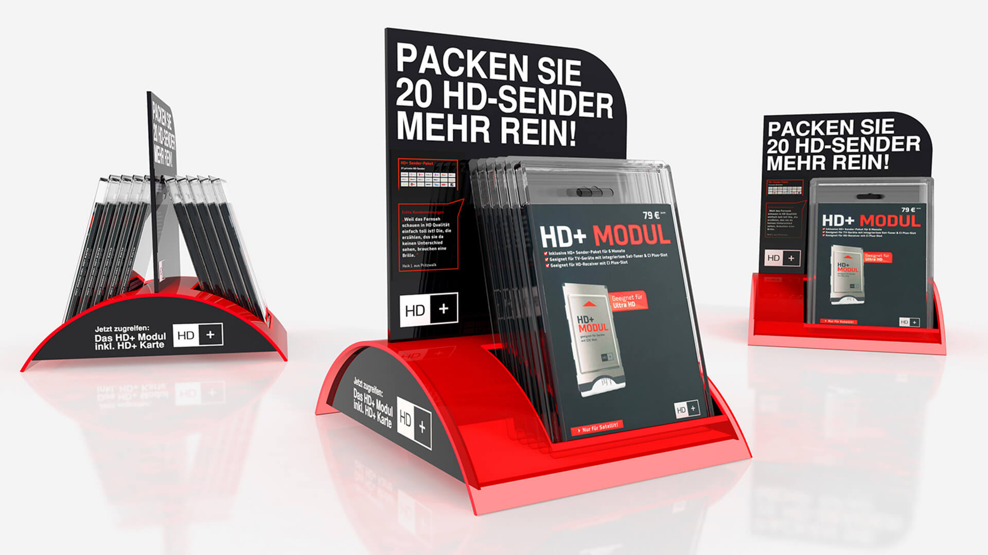 Für HD+, bekannt als Anbieter für hochauflösendes Fernsehen, übernehmen wir die deutschlandweite Ausstattung des Handels mit aufmerksamkeitsstarken Werbemitteln im Rahmen laufender Marketingkampagnen.