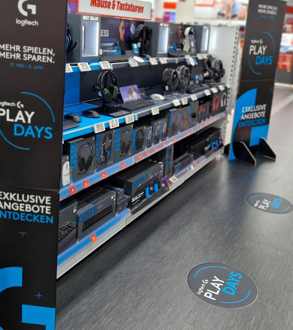 Ziel der Aktion war es, die Gaming-Community in die Märkte zu holen, die Produkte erlebbar zu machen und eine flächendeckende Markenpräsenz für die Logi Play Days zu schaffen – erfolgreich umgesetzt durch eine Kombination aus klassischer PoS-Ausstattung und interaktiven Erlebnisflächen.