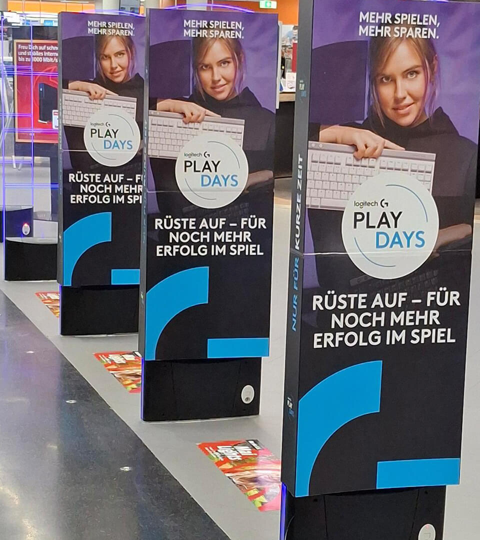 Für die Logi Play Days statteten wir deutschlandweit zahlreiche Media Märkte mit aufmerksamkeitsstarken PoS-Materialien aus – im Fokus: Gaming hautnah erlebbar machen und die Zielgruppe direkt am Point of Sale aktivieren.